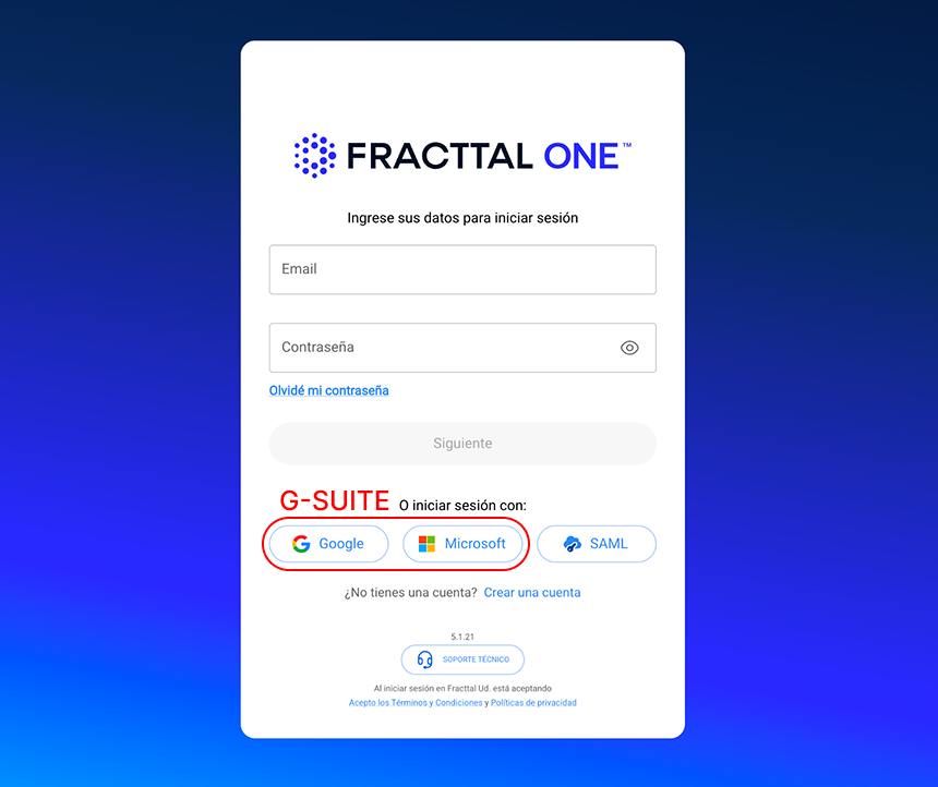 La autenticación SSO con G-SUITE (Google) y con Office 365 (Microsoft), está implementada de manera nativa dentro de Fracttal.