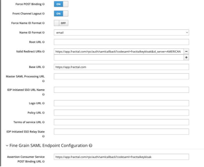 | Valid Redirect URIs | https://app.fracttal.com/rpc/auth/samlcallback?codesaml=fracttalkeykloak&id_server=AMERICAN | Return URI to Fracttal |