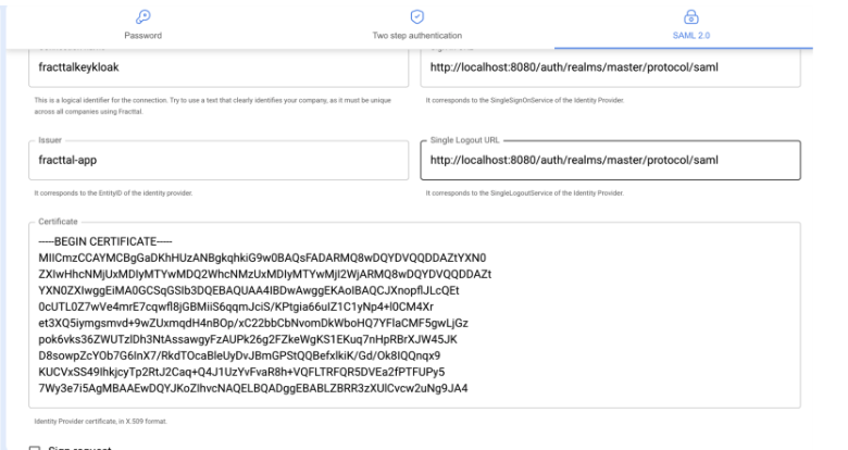 - SAML configuration key name (for example, in this document I use: fracttalkeykloak). This value must be unique and match the one configured in Keycloak.